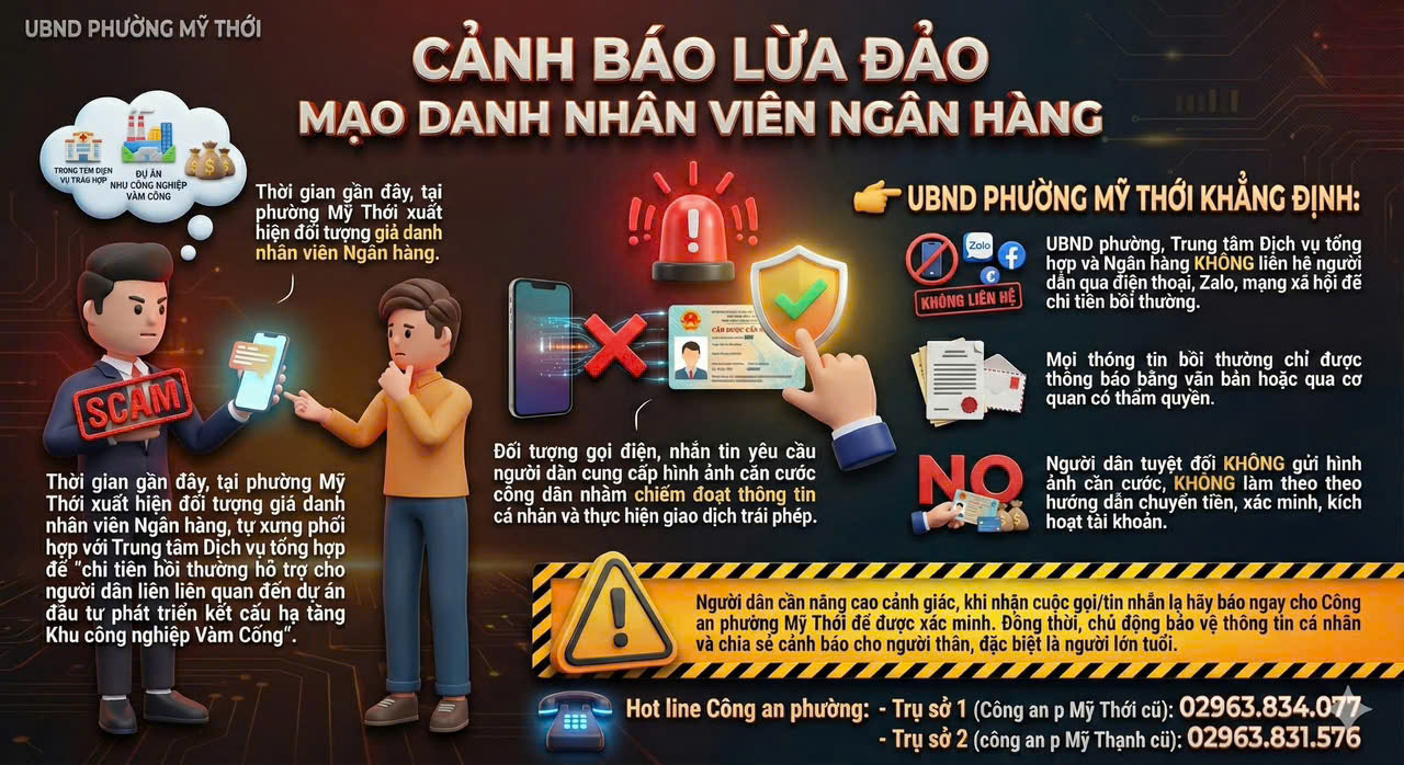 Thời gian gần đây, tại phường Mỹ Thới xuất hiện đối tượng giả danh nhân viên Ngân hàng, tự xưng phối hợp với Trung tâm Dịch vụ tổng hợp để “chi tiền bồi thường hỗ trợ cho người dân liên quan đến dự án đầu tư phát triển kết cấu hạ tầng Khu công nghiệp Vàm Cống”. Đối tượng gọi điện, nhắn tin yêu cầu người dân cung cấp hình ảnh căn cước công dân nhằm chiếm đoạt thông tin cá nhân và thực hiện giao dịch trái phép.