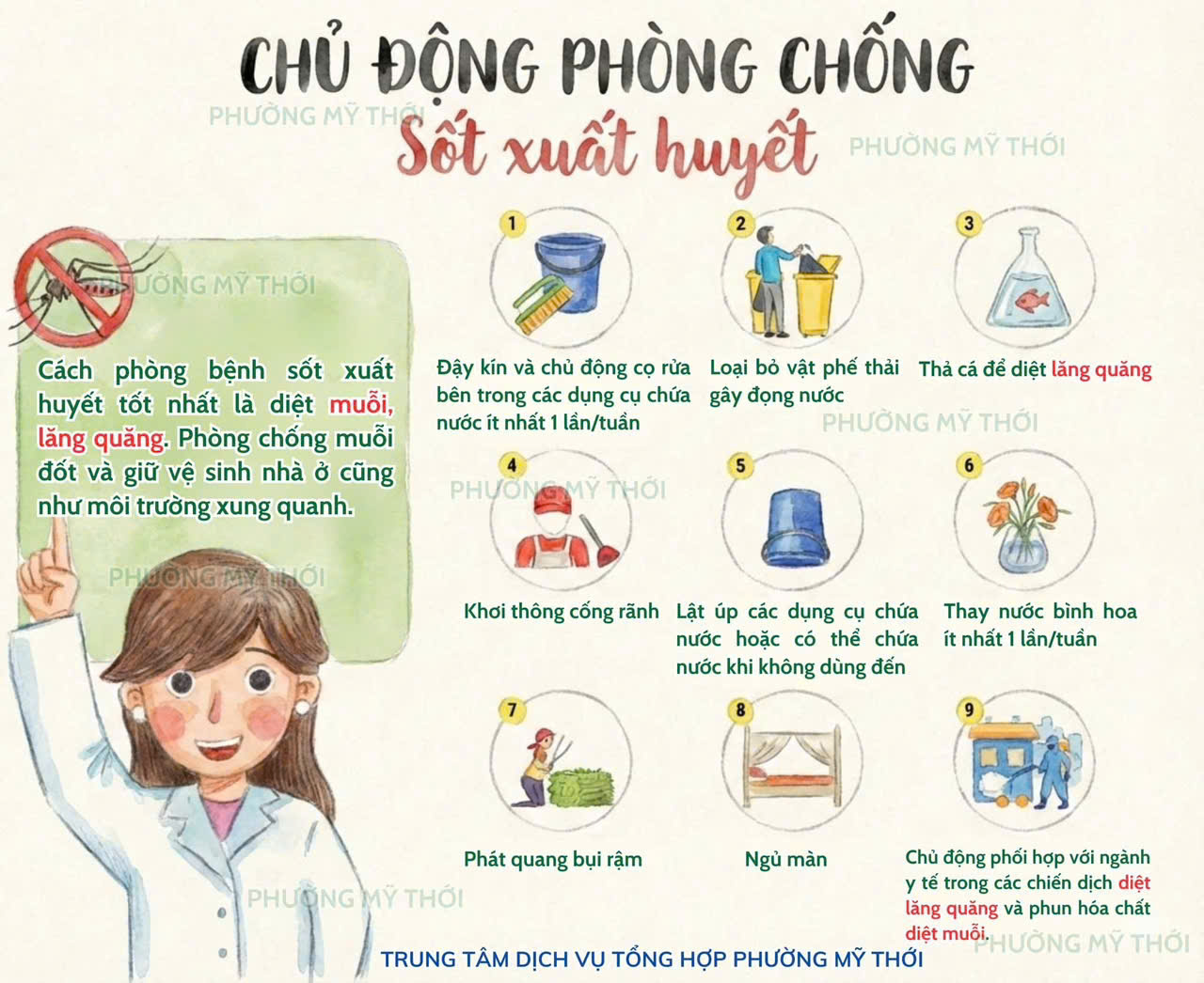 ✔ Giữ gìn vệ sinh môi trường: Thu gom rác thải, phát quang bụi rậm, không để nước tù đọng quanh nhà.