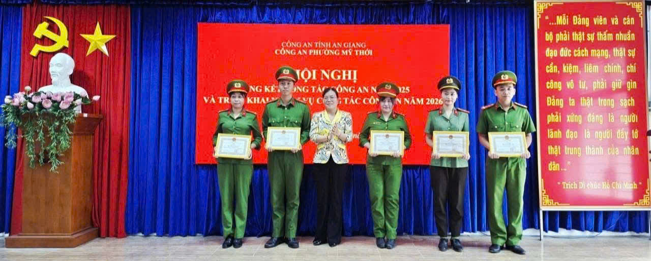 Dịp này, Công an tỉnh An Giang và UBND phường Mỹ Thới đã trao tặng Giấy khen cho 25 cá nhân có thành tích xuất sắc trong phong trào thi đua “Vì an ninh Tổ quốc” và công tác Công an năm 2025./