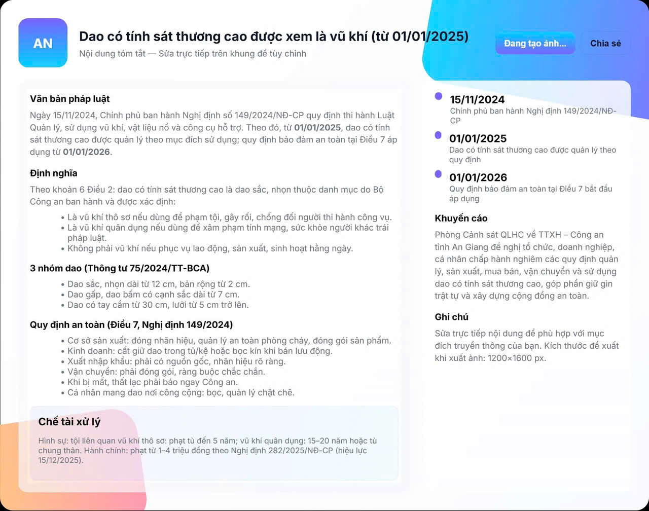Ngày 15/11/2024, Chính phủ ban hành Nghị định số 149/2024/NĐ-CP quy định một số điều và biện pháp thi hành Luật Quản lý, sử dụng vũ khí, vật liệụ nổ và công cụ hỗ trợ năm 2024, có hiệu lực thi hành từ ngày 01/01/2025. Riêng quy định về biện pháp bảo đảm an toàn trong hoạt động sản xuất, kinh doanh, xuất khẩu, nhập khẩu, vận chuyển, sử dụng dao có tính sát thương cao (theo Điều 7 Nghị định) có hiệu lực thi hành từ ngày 01/01/2026.