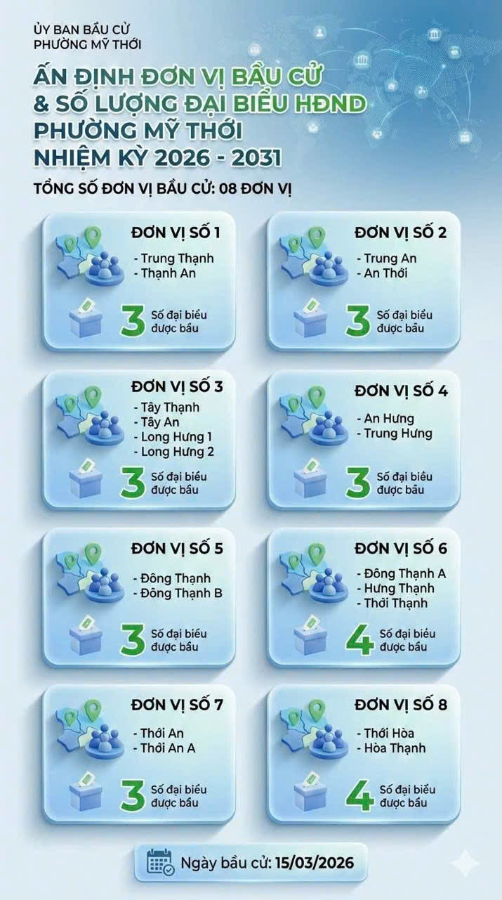 ĐƠN VỊ BẦU CỬ ĐẠI BIỂU QUỐC HỘI KHÓA XVI VÀ PHƯỜNG MỸ THỚI NHIỆM KỲ 2026 - 2031 ⏰ 15/03/2026 (CHỦ NHẬT)