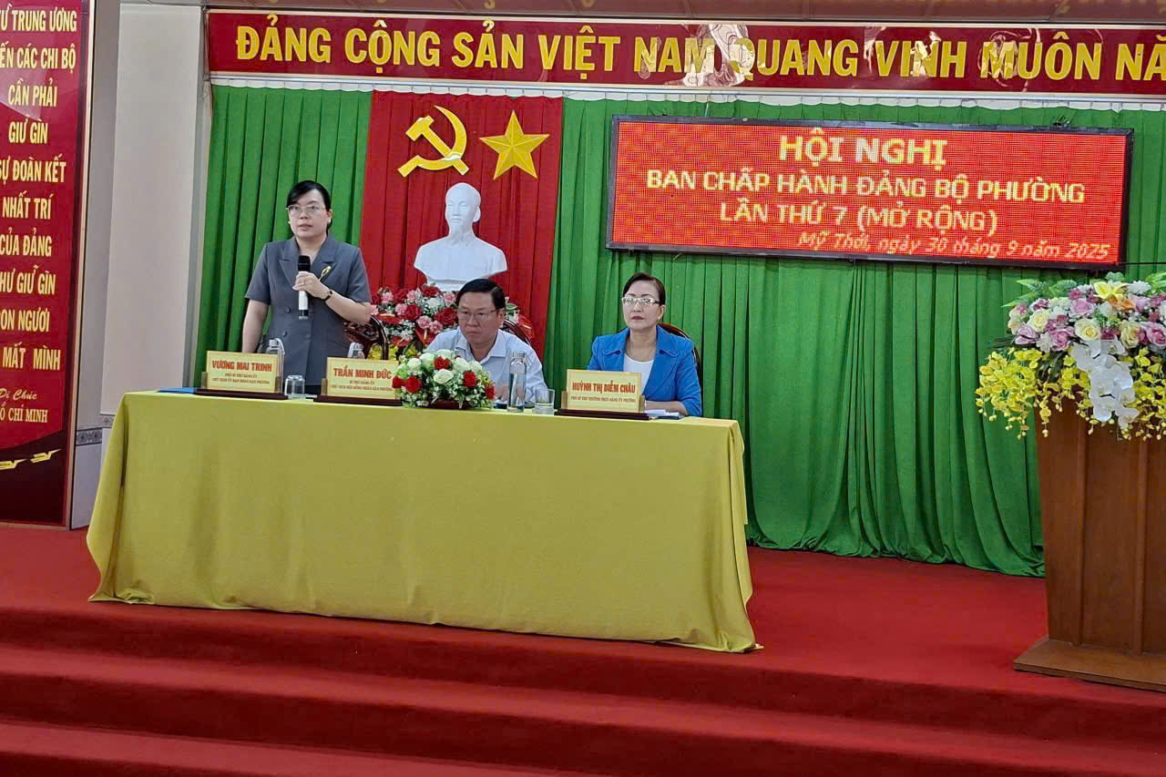 Sáng ngày 30/9, Ban Thường vụ Đảng ủy phường Mỹ Thới tổ chức Hội nghị lần thứ 07 (mở rộng) Ban Chấp hành Đảng bộ phường, nhiệm kỳ 2025-2030 để đánh giá tình hình thực hiện nhiệm vụ chính trị 9 tháng đầu năm và đề ra phương hướng, nhiệm vụ 3 tháng cuối năm 2025. Hội nghị do đồng chí Trần Minh Đức, Bí thư Đảng ủy, Chủ tịch HĐND phường Mỹ Thới chủ trì.