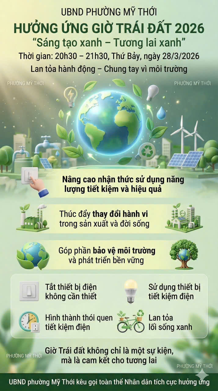 🌎 Giờ Trái đất không chỉ là một sự kiện, mà là cam kết cho tương lai. Hãy cùng nhau hành động hôm nay để gìn giữ một môi trường xanh – sạch – bền vững cho thế hệ mai sau. UBND phường Mỹ Thới kêu gọi toàn thể Nhân dân tích cực tham gia và hưởng ứng Chiến dịch Giờ Trái đất năm 2026./.