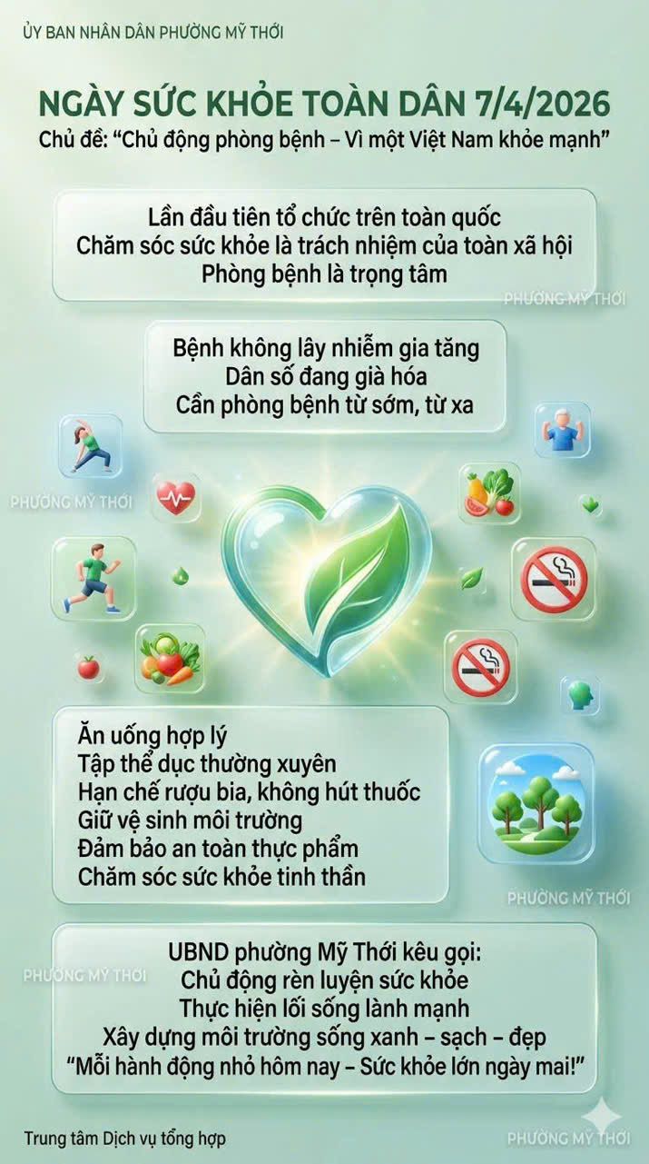 🤝 UBND phường Mỹ Thới kêu gọi toàn thể cán bộ và Nhân dân tích cực hưởng ứng Ngày Sức khỏe toàn dân; chủ động rèn luyện thân thể, thực hiện lối sống lành mạnh; chung tay xây dựng môi trường sống xanh – sạch – đẹp, vì sức khỏe bản thân, gia đình và cộng đồng.