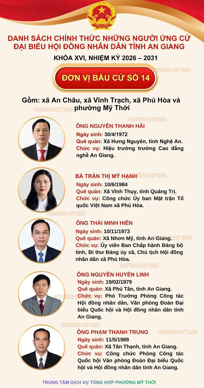 DANH SÁCH CHÍNH THỨC NHỮNG NGƯỜI ỨNG CỬ ĐẠI BIỂU HĐND TỈNH AN GIANG KHÓA XVI NHIỆM KỲ 2026 - 2031 TẠI ĐƠN VỊ BẦU CỬ SỐ 14 GỒM XÃ AN CHÂU, XÃ VĨNH TRẠCH, XÃ PHÚ HÒA, PHƯỜNG MỸ THỚI