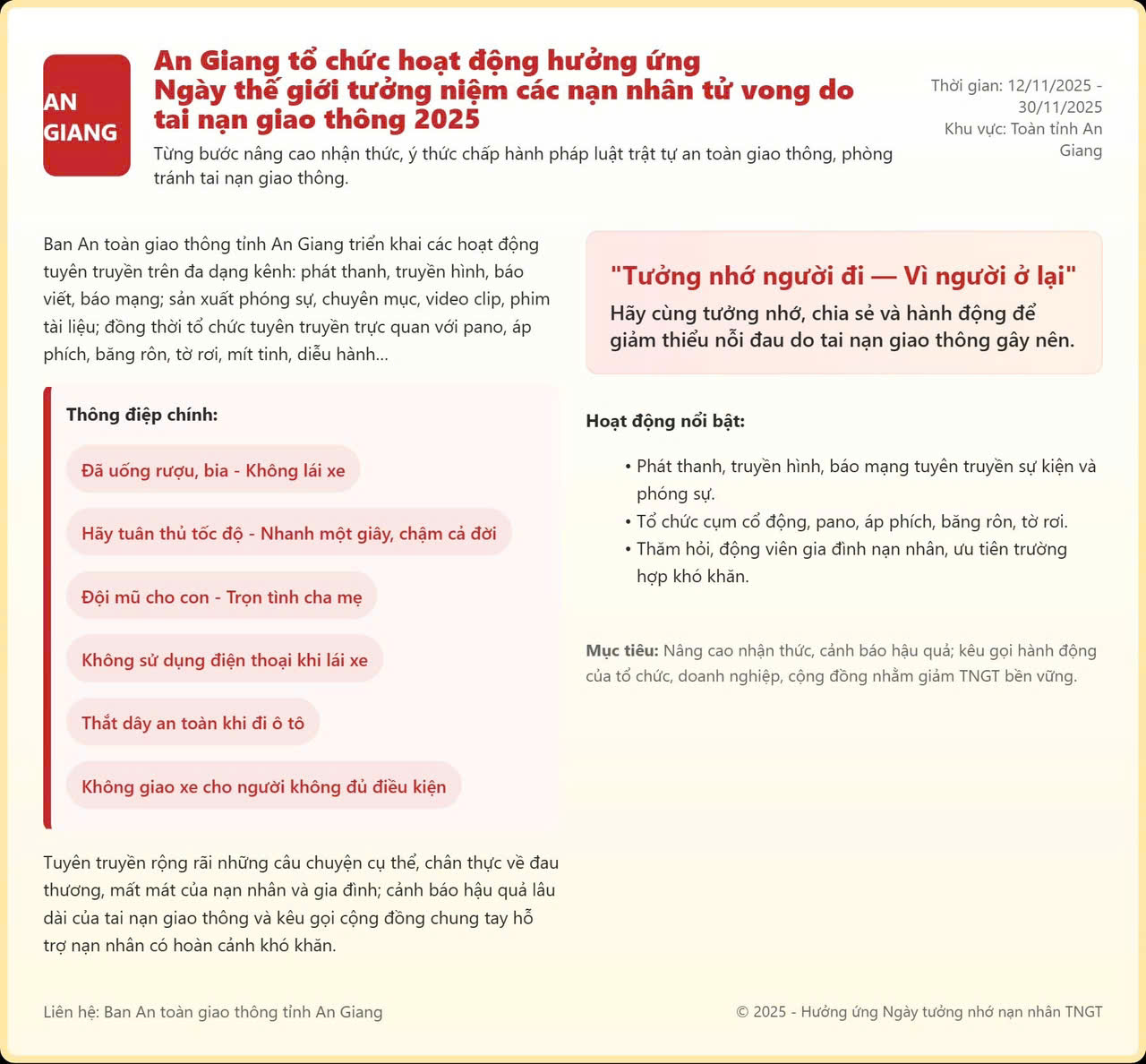 Các hoạt động tưởng niệm các nạn nhân tử vong do tai nạn giao thông nhằm thể hiện sự quan tâm, chia sẻ của Đảng, Nhà nước và toàn xã hội đối với các nạn nhân và gia đình nạn nhân tử vong do tai nạn giao thông. Qua đó, góp phần lan tỏa giá trị nhân văn, tinh thần yêu thương, trách nhiệm cộng đồng.