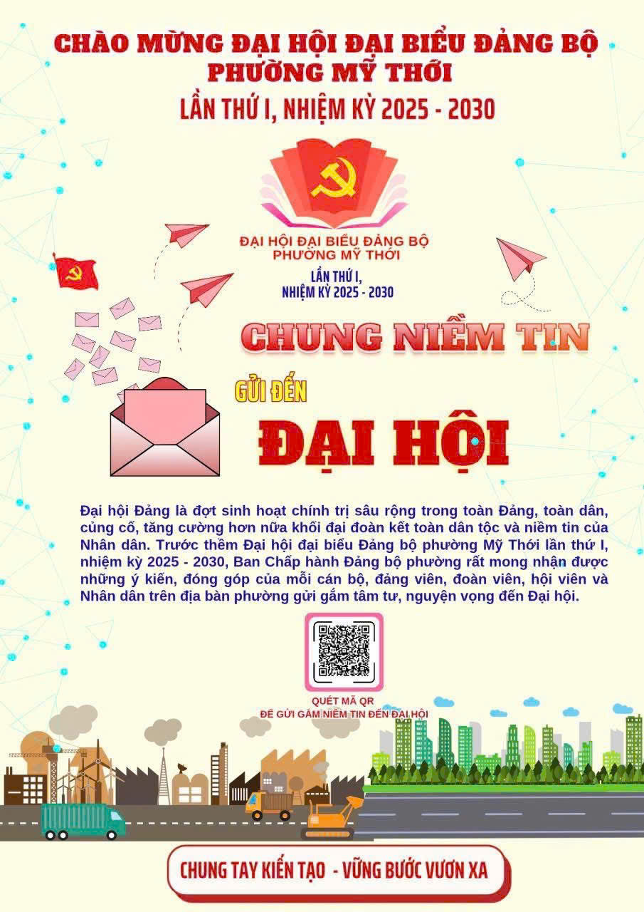 Đại hội đại biểu Đảng bộ phường Mỹ Thới lần thứ I, nhiệm kỳ 2025 – 2030 là đợt sinh hoạt chính trị sâu rộng trong toàn Đảng, toàn dân, củng cố, tăng cường hơn nữa khối đại đoàn kết toàn dân tộc và niềm tin của Nhân dân địa phương. “Chung niềm tin” là cơ hội, là thông điệp, là tâm tư, nguyện vọng để mỗi cán bộ, đảng viên, đoàn viên, hội viên và Nhân dân trên địa bàn gửi đến Đại hội.