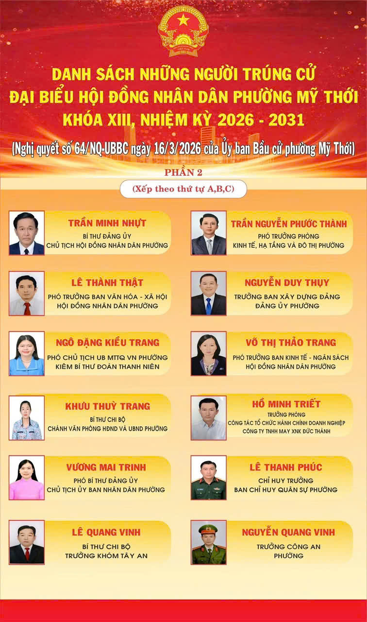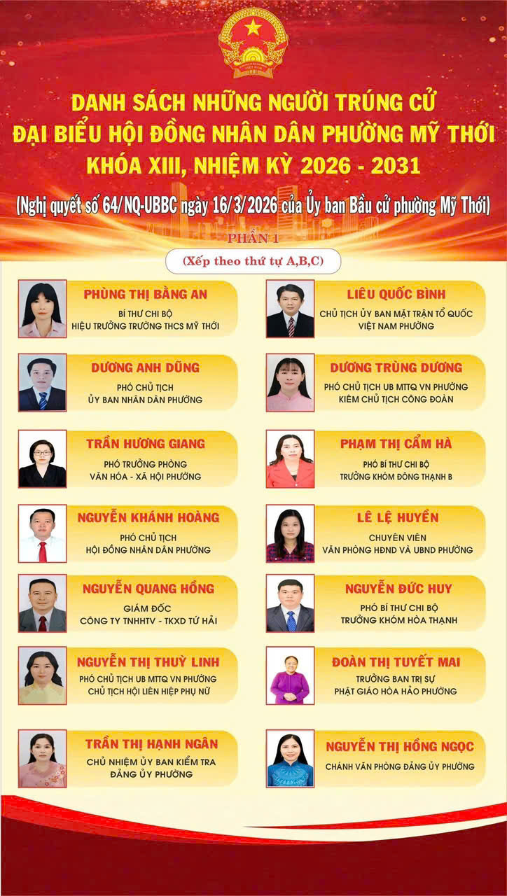 MỸ THỚI - CÔNG BỐ KẾT QUẢ BẦU CỬ VÀ DANH SÁCH NGƯỜI TRÚNG CỬ ĐẠI BIỂU HĐND PHƯỜNG KHÓA XIII, NHIỆM KỲ 2026 – 2031