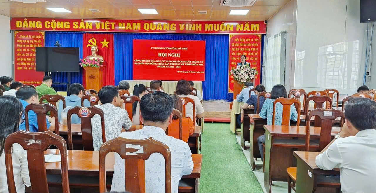 Chiều ngày 19/3, Ủy ban bầu cử phường Mỹ Thới tổ chức Hội nghị công bố kết quả và danh sách người trúng cử đại biểu Hội đồng nhân dân phường Mỹ Thới khóa XIII, nhiệm kỳ 2026 – 2031. Đến dự có bà Huỳnh Thị Diễm Châu, Phó Bí thư Thường trực Đảng ủy phường. Bà Vương Mai Trinh, Phó Bí thư Đảng ủy, Chủ tịch UBND phường, Chủ tịch Ủy ban bầu cử phường chủ trì hội nghị.