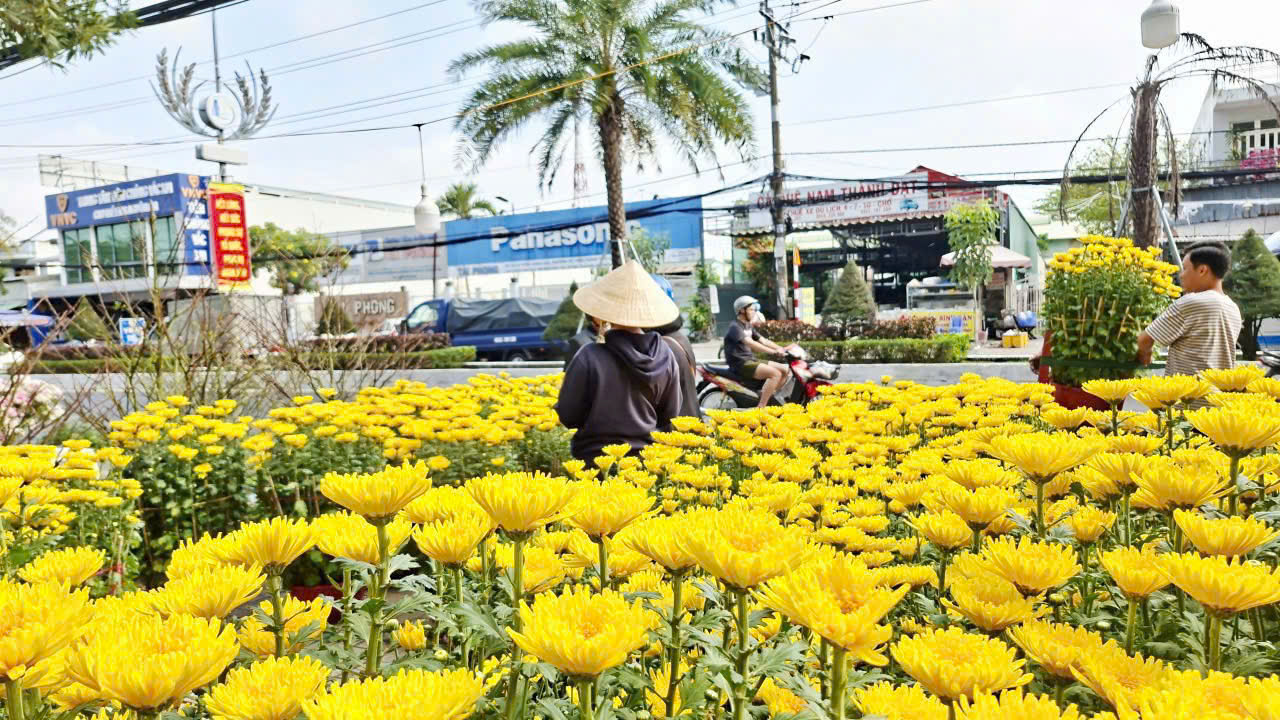 Gió xuân vừa khẽ thổi qua mấy hàng cây ven sông, tự nhiên lòng người cũng thấy nao nao. Mỹ Thới những ngày cuối năm không ồn ào vội vã, mà rộn ràng theo cách rất riêng – tiếng xe xuôi ngược ngoài đường, tiếng gọi nhau í ới quen thuộc, sắc cờ đỏ thắm trước hiên nhà. Tết, vậy là đã thật gần.