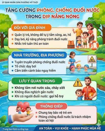 ❇Trong thời gian cao điểm nắng nóng, nhu cầu tắm sông, ao, hồ của người dân, đặc biệt là trẻ em, tăng cao, tiềm ẩn nhiều nguy cơ tai nạn đuối nước. Nhằm bảo vệ an toàn tính mạng cho người dân, phường Mỹ Thới kêu gọi toàn thể cộng đồng nâng cao ý thức phòng, chống đuối nước.
