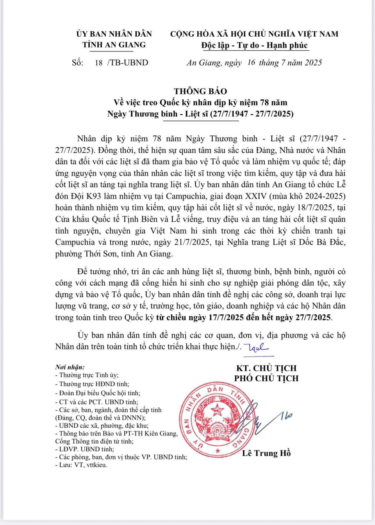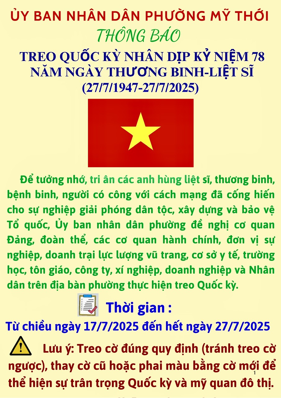 THÔNG BÁO TREO CỜ TỔ QUỐC NHÂN DỊP KỶ NIỆM 78 NĂM NGÀY THƯƠNG BINH-LIỆT SĨ