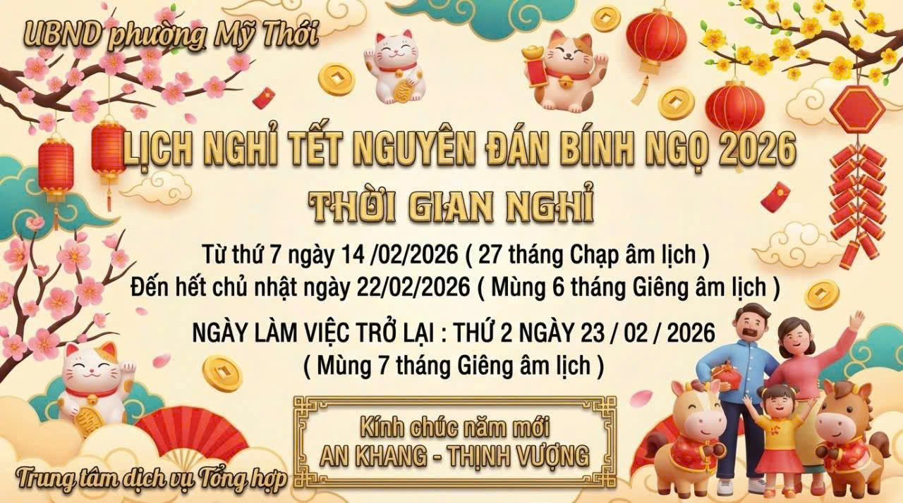 UBND PHƯỜNG MỸ THỚI THÔNG BÁO LỊCH NGHỈ TẾT NGUYÊN ĐÁN BÍNH NGỌ 2026