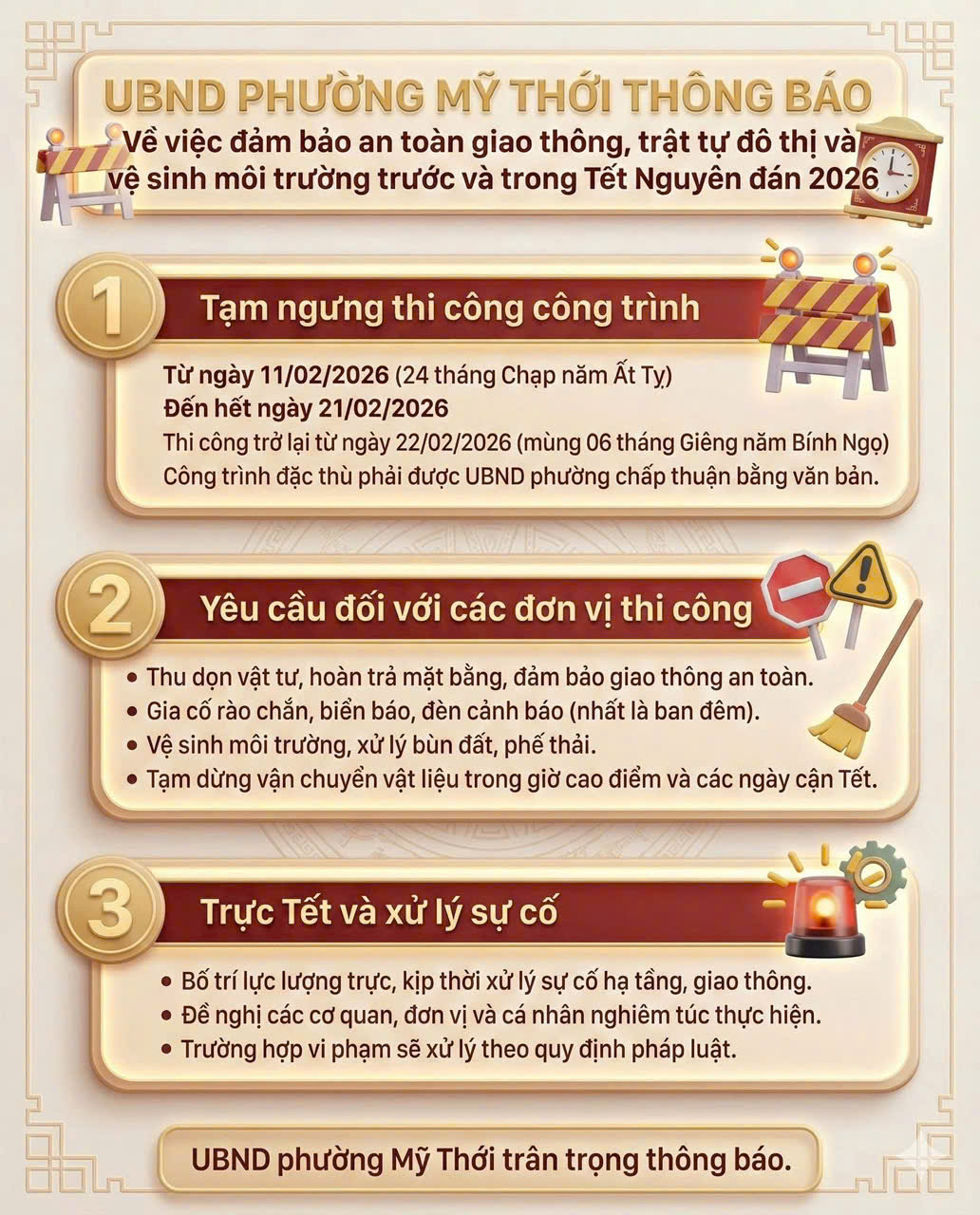 UBND PHƯỜNG MỸ THỚI THÔNG BÁO VỀ VIỆC ĐẢM BẢO AN TOÀN GIAO THÔNG, TRẬT TỰ ĐÔ THỊ, VỆ SINH MÔI TRƯỜNG TRƯỚC, TRONG VÀ SAU TẾT NGUYÊN ĐÁN 2026