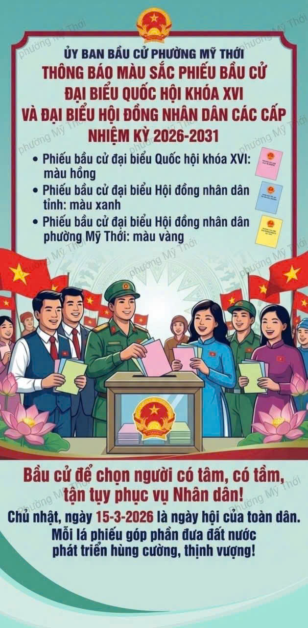 ỦY BAN BẦU CỬ PHƯỜNG MỸ THỚI - THÔNG BÁO MÀU SẮC PHIẾU BẦU CỬ ĐẠI BIỂU QUỐC HỘI KHÓA XVI VÀ ĐẠI BIỂU HĐND CÁC CẤP NHIỆM KỲ 2026 - 2031