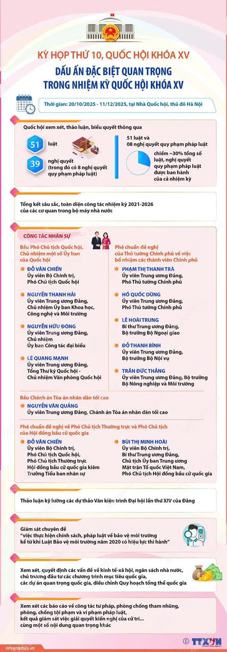 Sau 40 ngày (20/10/2025 - 11/12/2025) làm việc liên tục, khẩn trương, nghiêm túc, với tinh thần khoa học, đổi mới, trách nhiệm cao, Kỳ họp thứ 10, Quốc hội khóa XV đã hoàn thành toàn bộ nội dung, chương trình đề ra. Tại Kỳ họp này, Quốc hội đã xem xét, thông qua 51 luật, 08 nghị quyết quy phạm pháp luật - đây là con số lớn nhất từ trước đến nay tại một kỳ họp Quốc hội; tiến hành tổng kết công tác nhiệm kỳ 2021 - 2026 của các cơ quan trong bộ máy nhà nước; xem xét, quyết định công tác nhân sự thuộc thẩm quyền; thảo luận, góp ý kiến về dự thảo Văn kiện trình Đại hội đại biểu toàn quốc lần thứ XIV của Đảng; xem xét, quyết định các vấn đề về kinh tế - xã hội, ngân sách nhà nước, chủ trương đầu tư các chương trình mục tiêu quốc gia, các dự án quan trọng quốc gia, điều chỉnh Quy hoạch tổng thể quốc gia…
