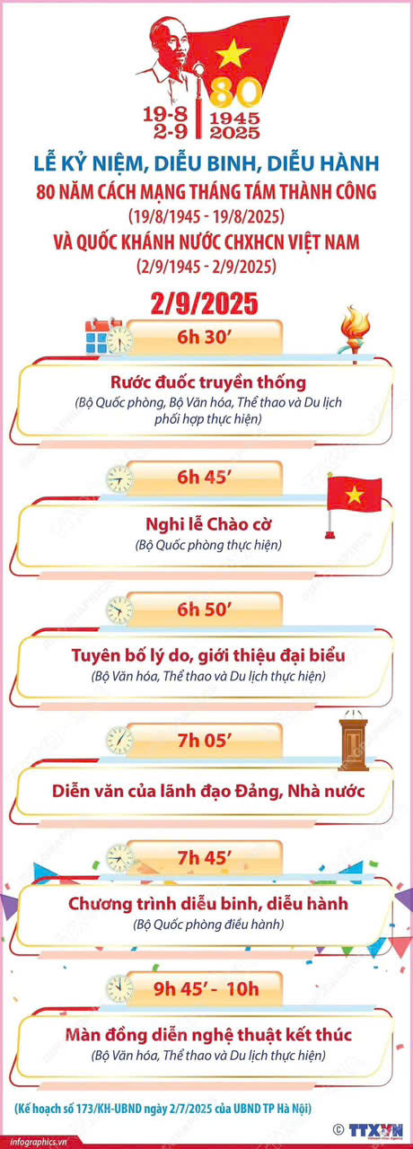 Lễ kỷ niệm, diễu binh, diễu hành 80 năm Cách mạng Tháng Tám thành công (19/8/1945 - 19/8/2025) và Quốc khánh nước CHXHCN Việt Nam (2/9/1945 - 2/9/2025) sẽ diễn ra vào ngày 2/9/2025 tại Hà Nội. Theo kế hoạch, Chương trình sẽ bắt đầu vào lúc 6h30 với hoạt động rước đuốc truyền thống; tiếp đến là Nghi lễ Chào cờ; Tuyên bố lý do, giới thiệu đại biểu; Diễn văn của lãnh đạo Đảng, Nhà nước và Chương trình diễu binh, diễu hành…