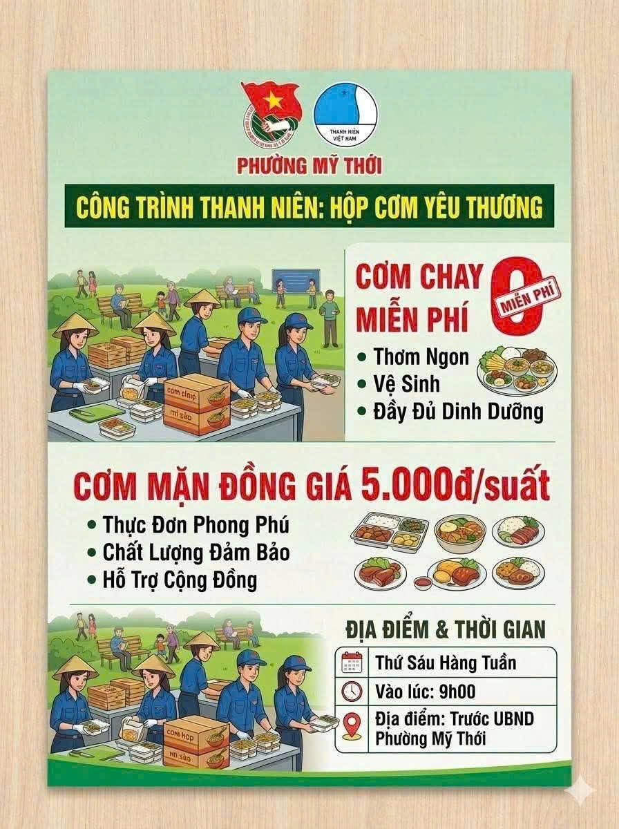 Nhân dịp Ngày Quốc tế Hạnh phúc 20/3, Đoàn phường Mỹ Thới đã tiếp tục hoạt động ý nghĩa mô hình “Hộp cơm yêu thương”, nhằm sẻ chia, hỗ trợ những hoàn cảnh khó khăn trên địa bàn, góp phần lan tỏa giá trị nhân ái trong cộng đồng.
