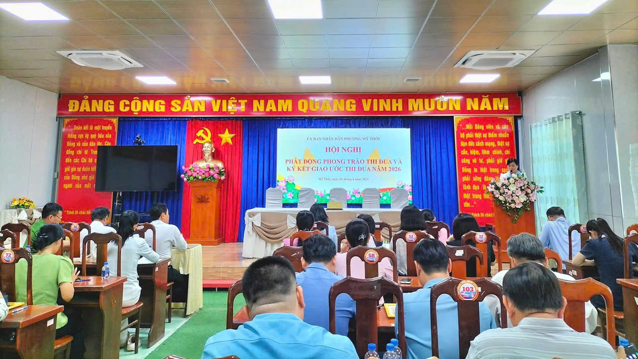 💐 Chiều 01/4, UBND phường Mỹ Thới tổ chức Hội nghị phát động phong trào thi đua và ký kết giao ước thi đua năm 2026. Tham dự có bà Huỳnh Thị Diễm Châu – Phó Bí thư Thường trực Đảng ủy phường. Bà Vương Mai Trinh – Phó Bí thư Đảng ủy, Chủ tịch UBND phường chủ trì hội nghị.