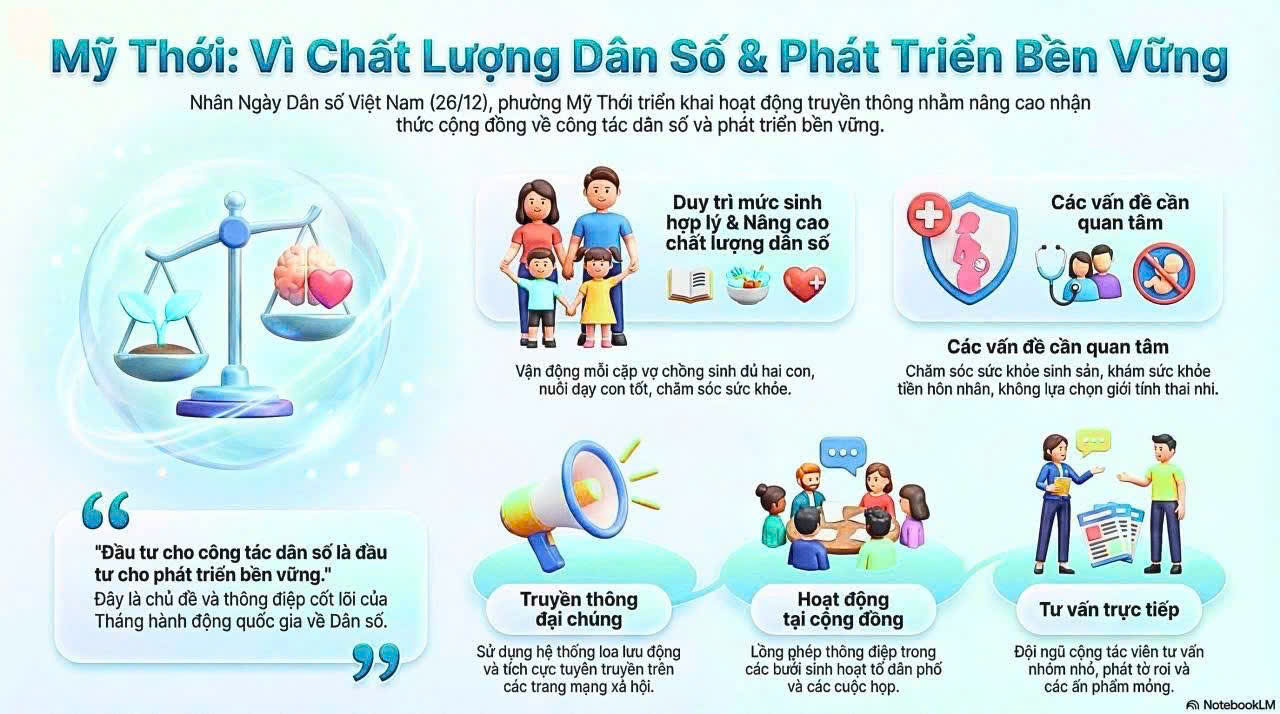 Hưởng ứng Tháng hành động quốc gia về Dân số và kỷ niệm Ngày Dân số Việt Nam (26/12), phường Mỹ Thới đã và đang triển khai nhiều hoạt động tuyên truyền thiết thực, nhằm nâng cao nhận thức của người dân về công tác dân số trong tình hình mới. Nhiều hoạt động truyền thông được triển khai đồng bộ từ phường tới các tổ dân phố, địa bàn dân cư thu hút sự tham gia tích cực của người dân, góp phần nâng cao nhận thức, chất lượng dân số và hướng tới mục tiêu phát triển bền vững.