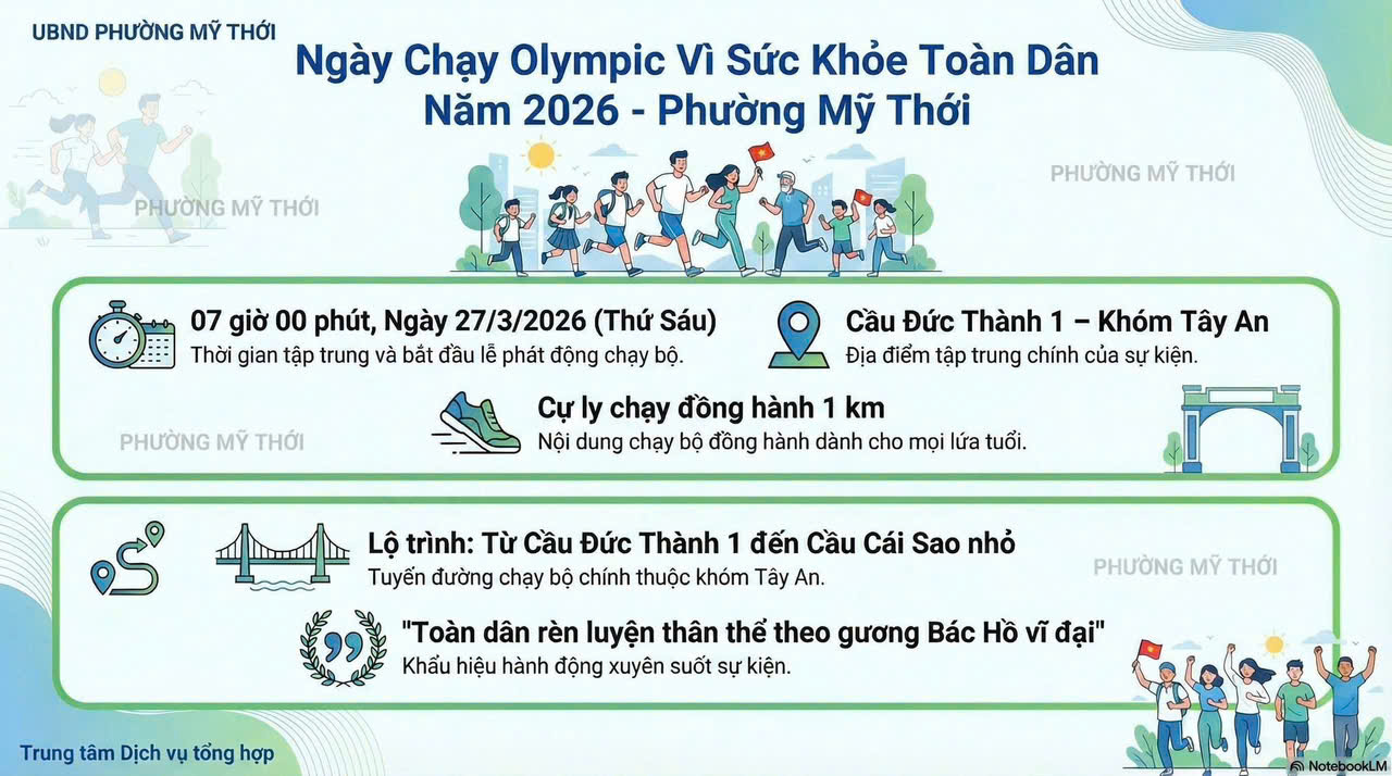 🏃♀️Hưởng ứng phong trào rèn luyện thân thể theo gương Bác Hồ vĩ đại, UBND phường Mỹ Thới triển khai Kế hoạch số 3063/KH-UBND ngày 20/03/2026 về việc tổ chức “Ngày chạy Olympic vì sức khỏe toàn dân” năm 2026. Sự kiện nhằm lan tỏa tinh thần thể dục thể thao, nâng cao sức khỏe cộng đồng và xây dựng lối sống năng động trong Nhân dân.