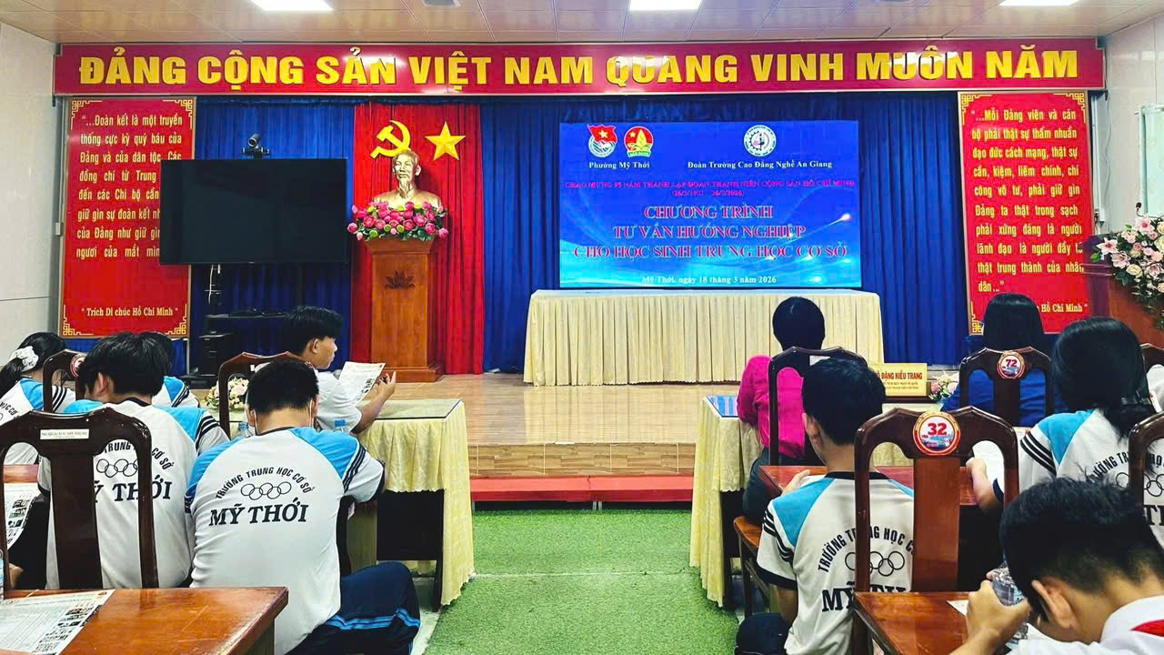 Thiết thực chào mừng kỷ niệm 95 năm Ngày thành lập Đoàn TNCS Hồ Chí Minh (26/3/1931 – 26/3/2026), chiều ngày 18/3, Phường Đoàn Mỹ Thới phối hợp với Đoàn Trường Cao đẳng Nghề An Giang tổ chức chương trình tư vấn, hướng nghiệp nghề dành cho 120 em học sinh đến từ các trường THCS trên địa bàn.