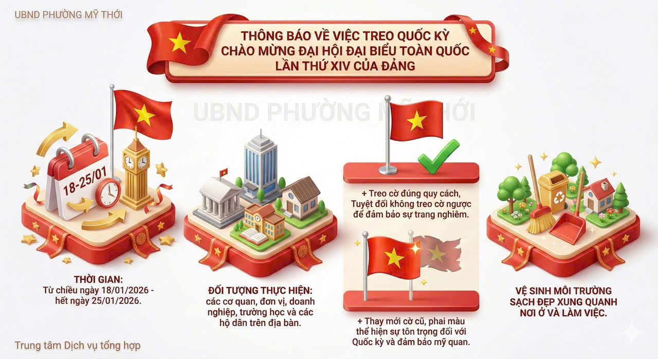 Hòa chung không khí phấn khởi của toàn Đảng, toàn quân và toàn dân, UBND phường Mỹ Thới thông báo đến các cơ quan, đơn vị và toàn thể Nhân dân trên địa bàn về việc treo Quốc kỳ và chỉnh trang đô thị, cụ thể như sau: