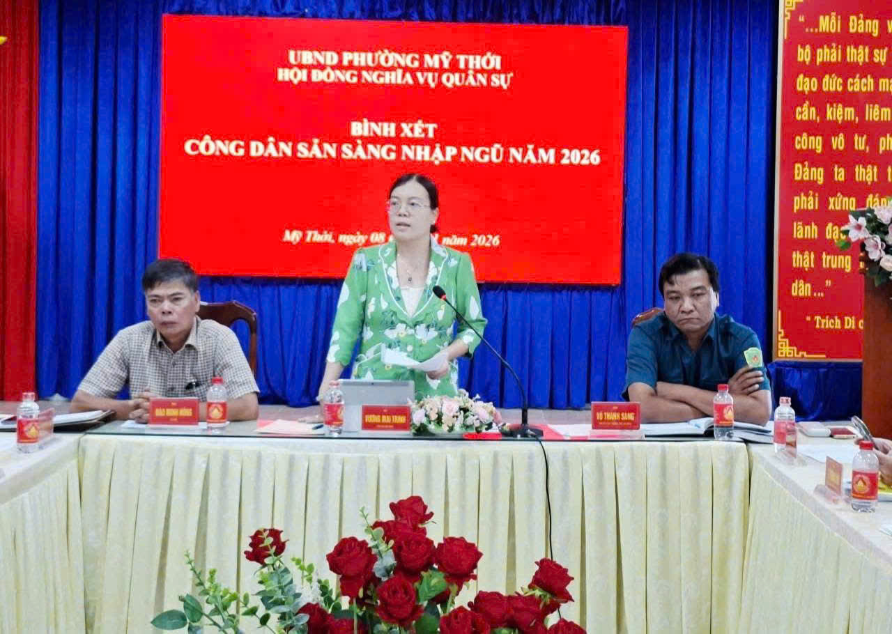 Phát biểu chỉ đạo tại hội nghị, Phó Bí thư Đảng uỷ, Chủ tịch UBND phường Mỹ Thới Vương Mai Trinh nhấn mạnh công tác tuyển chọn và gọi công dân nhập ngũ là nhiệm vụ trọng tâm, góp phần củng cố quốc phòng, an ninh và xây dựng lực lượng vũ trang vững mạnh. Đồng chí yêu cầu Hội đồng Nghĩa vụ Quân sự phường thực hiện nghiêm túc quy trình xét duyệt, đúng thời gian quy định; lập danh sách công dân đủ điều kiện gọi nhập ngũ và tham gia nghĩa vụ Công an nhân dân trình cấp trên xem xét. Bên cạnh đó, Chủ tịch UBND phường cũng đề nghị các gia đình tiếp tục quan tâm, động viên con em chấp hành nghiêm lệnh gọi nhập ngũ; các thanh niên trong độ tuổi nêu cao tinh thần trách nhiệm, chấp hành tốt quy định cư trú, góp phần để công tác tuyển quân năm 2026 của phường Mỹ Thới đạt kết quả tốt./.