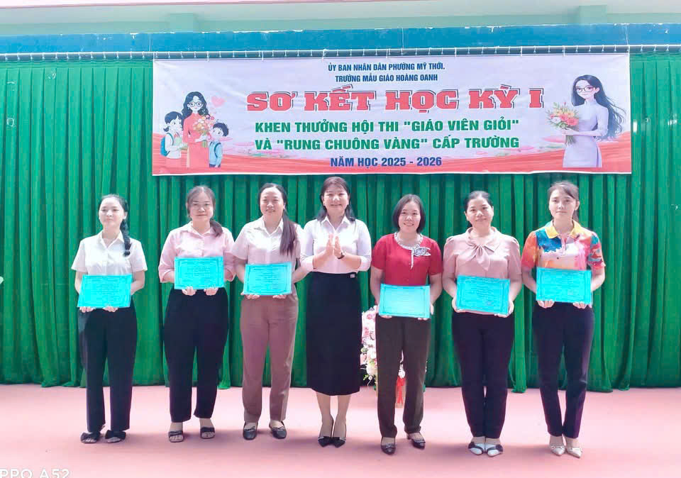 Dịp này, Trường Mẫu giáo Hoàng Oanh trao khen thưởng cho 06 giáo viên đạt danh hiệu GVDG mầm non cấp trường. Tuyên dương, khen thưởng cho 03 tập thể và 03 cá nhân đạt thành tích xuất sắc trong Hội thi “Rung chuông vàng” chủ đề “ An Toàn Giao thông cho bé” cấp trường. Đây là những hoạt động chuyên môn có ý nghĩa quan trọng nhằm khuyến khích tinh thần sáng tạo trong giảng dạy, tạo môi trường học tập tích cực, phát huy tính chủ động, tự tin cho trẻ. Đồng thời, hoạt động không chỉ là dịp đánh giá kết quả thực hiện nhiệm vụ chuyên môn, mà còn thể hiện sự quan tâm sâu sát của nhà trường đối với công tác thi đua – khen thưởng, kịp thời ghi nhận những nỗ lực, đóng góp của đội ngũ cán bộ, giáo viên trong quá trình thực hiện nhiệm vụ.