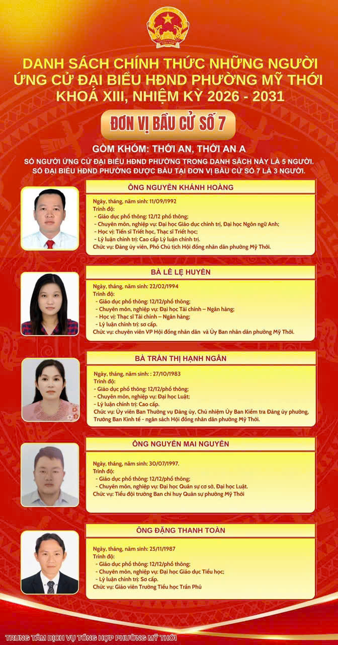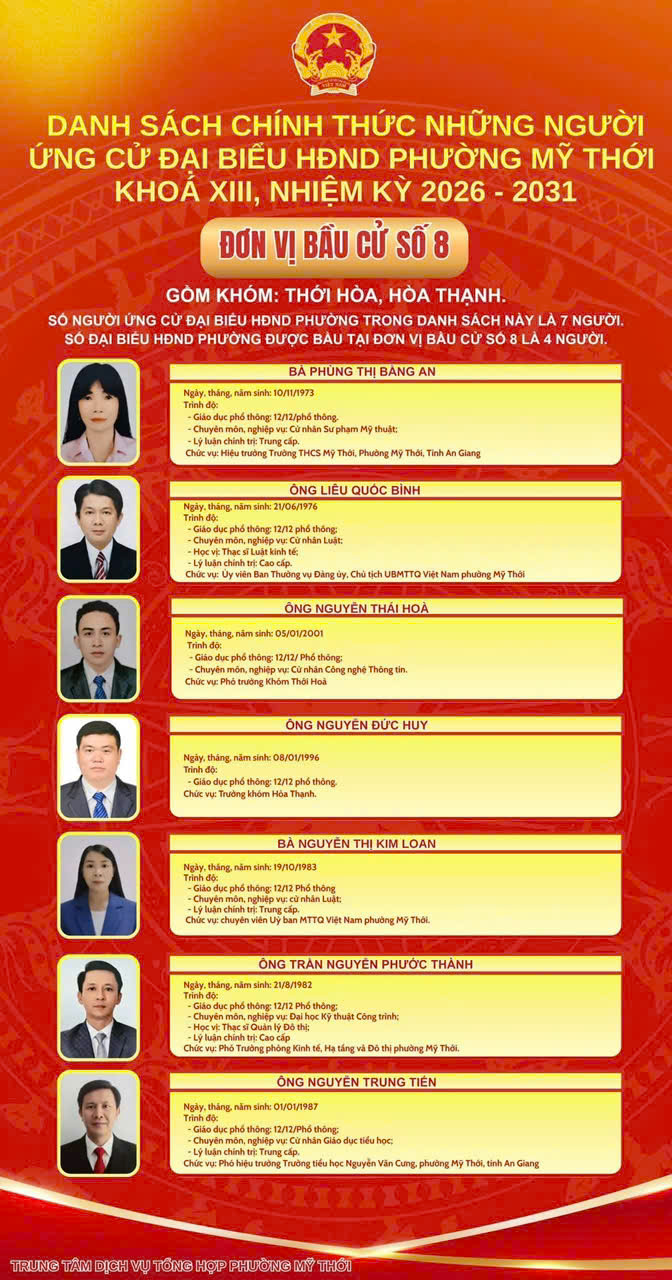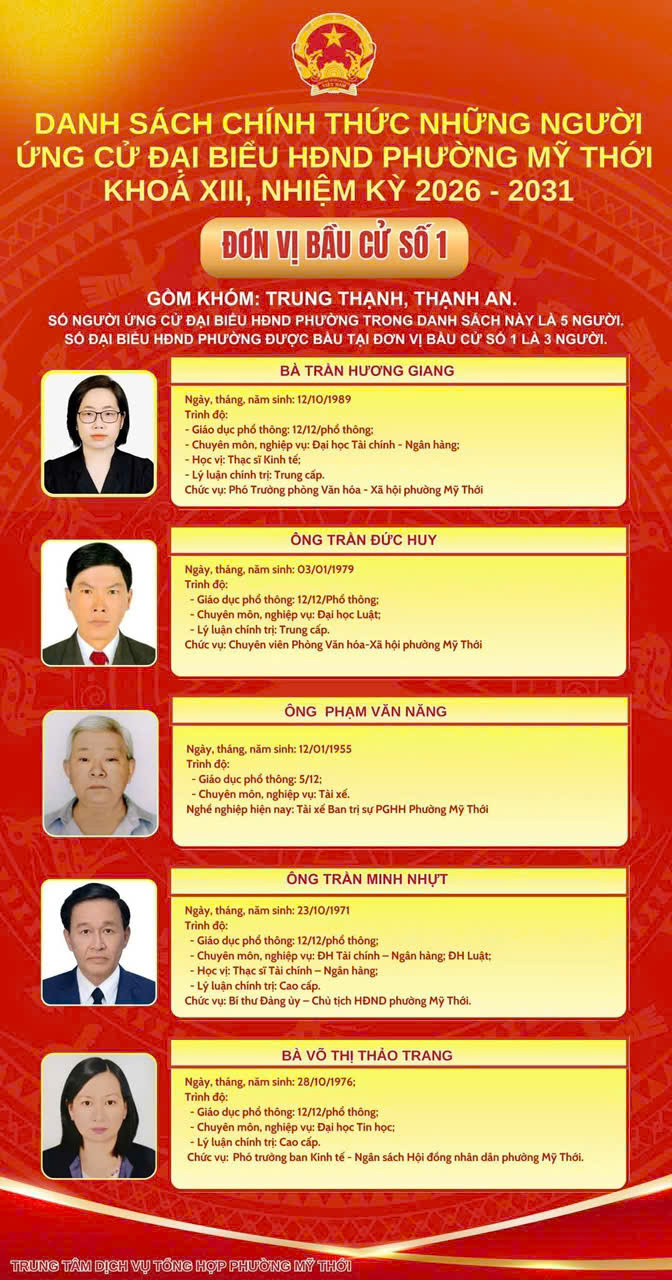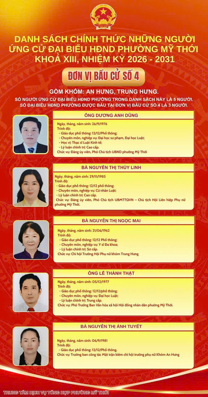 Ủy ban Bầu cử phường Mỹ Thới công bố danh sách 44 người ứng cử đại biểu HĐND phường nhiệm kỳ 2026 - 2031 tại 8 đơn vị bầu cử trên địa bàn phường để bầu 26 đại biểu HĐND phường khóa mới.
