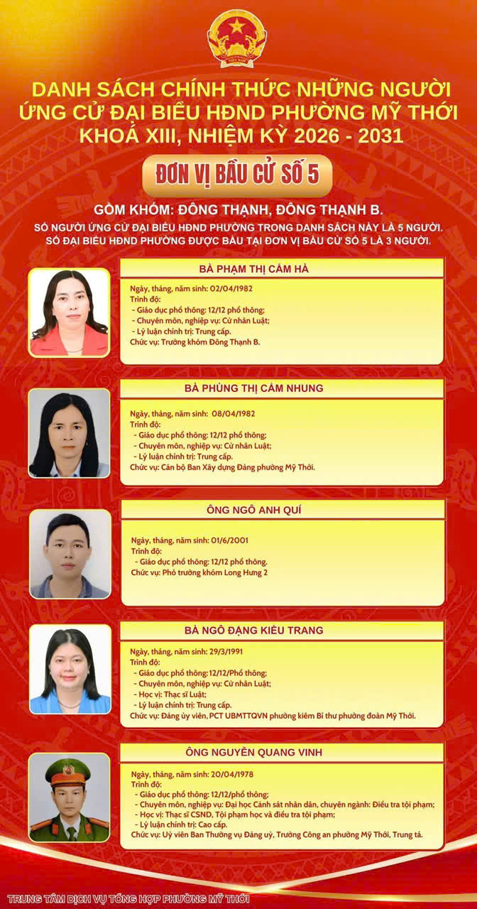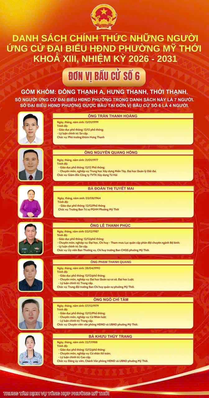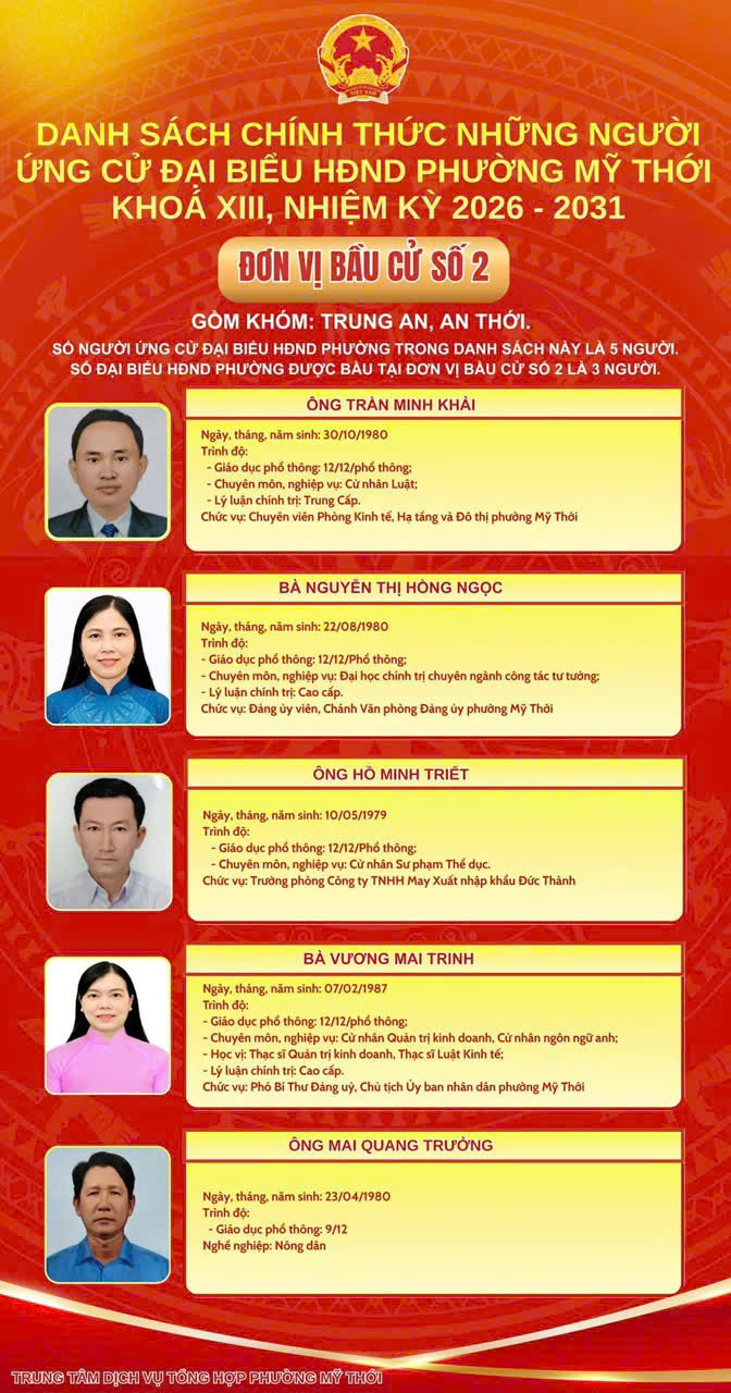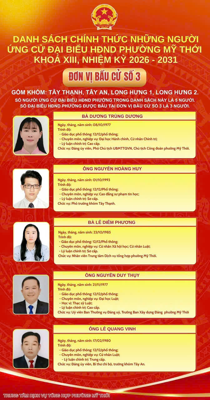 Ủy ban Bầu cử phường Mỹ Thới công bố danh sách 44 người ứng cử đại biểu HĐND phường nhiệm kỳ 2026 - 2031 tại 8 đơn vị bầu cử trên địa bàn phường để bầu 26 đại biểu HĐND phường khóa mới.
